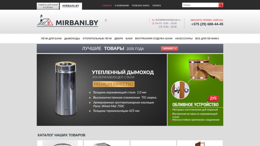 | AI-анализ | This online resource, Mirbani.by, offers a wide selection of products for saunas and baths in Minsk. The website includes various useful items such as heating stoves, fireplaces, chimneys, insulation materials, and interior decorations for bathrooms. Brands offered include Kronos, Vezuвий, Thermofor, and Chugunnye Pechi, among others. The website also features categories for ovens, doors, basins, and cleaning supplies. The contact information provided is a phone number +375 (29) 688-44-45 and an email address 80296884445@mail.ru. The operating hours listed are from 9:00 to 19:00 on weekdays and from 9:00 to 18:00 on Satur |