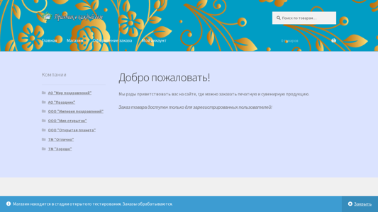 | AI-анализ | The website "This online resource" is for ordering printed and souvenir products online. The homepage includes a search function, links to the shop, account management, and order placement. The website is under open testing and only registered users can make purchases. Companies such as AO "Mir pozdравleniy," AO "Prazdnik," OOO "Imperia pozdravleniy," OOO "Mir otkrytk," OOO "Otvetitelnaya planeta," TM "Otlichno," and TM "Khorosho" provide the products. The cart is empty. The website operates on Storefront and WooCommerce. |
