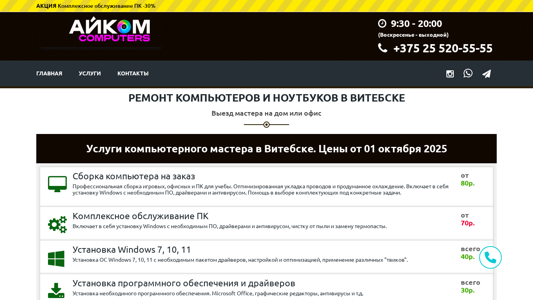 | SEO-описание | Тел: +375 25 520-55-55. Ремонт и техническое обслуживание компьютеров, ноутбуков в Витебске с выездом на дом или офис. Решение компьютерных проблем в день обращения. Самые низкие цены в городе. Гарантия на все виды работ. Мгновенный вызов мастера на дом или офис. Установка Windows любых версий, чистка от пыли, замена термопасты, ремонт любой сложности. Бесплатная диагностика при дальнейшем ремонте у нас. |