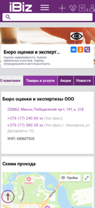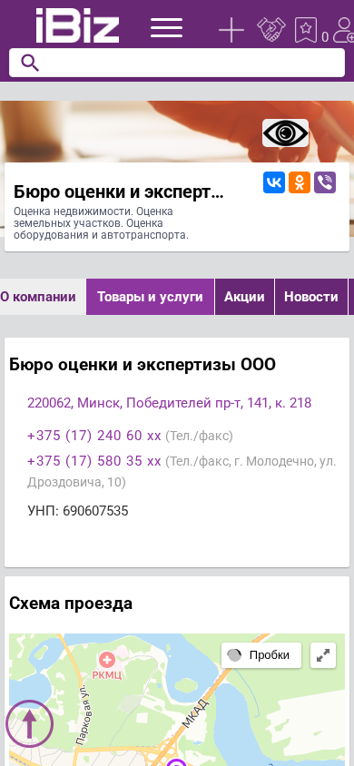 | AI-анализ | The website is a business firm named 'Бюро оценки и экспертизы ООО - Оценка недвижимости. Оценка земельных участков. Оценка оборудования и автотранспорта' located at 220062, Минск, Победителей пр-т, 141, к. 218. The company provides assessment and expert services for real estate, land plots, machinery, and vehicles. The contact information, including phone numbers and addresses, is provided on the website for the main office in Minsk and a branch office in Minsk, Molodechnogo pr-t, 10. The company's Unified State Register number is 690607535. The website offers various services such as auto expertise, technical assistance, evac |