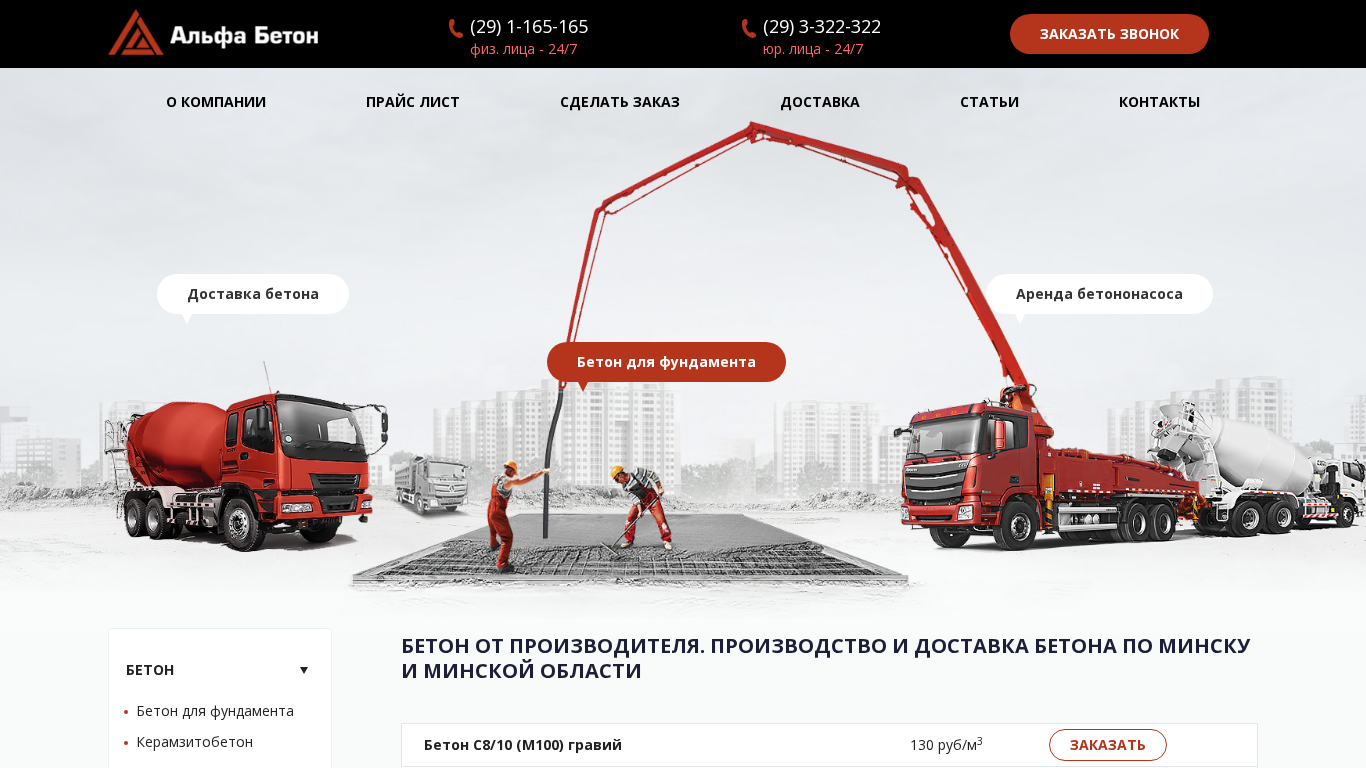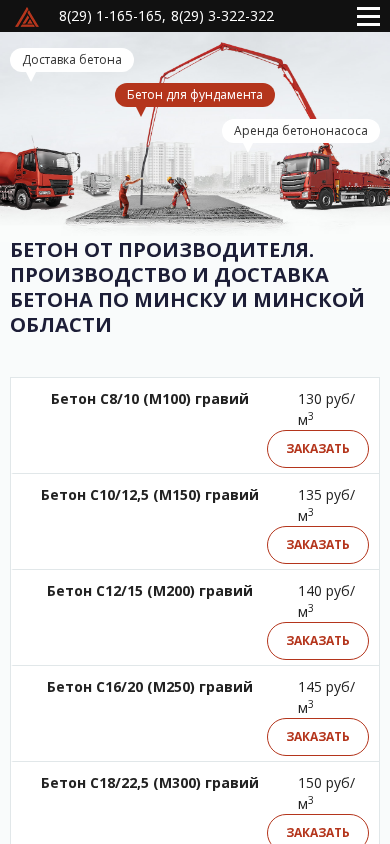 | AI-анализ | --- This online resource is a reliable supplier of concrete and mortar in Minsk and the Minsk region, operating from its own production base under the name Альфа-бетон. The website offers various types of concrete and gravel for different applications, including foundations, and the option to rent a concrete pump. Prices for the offered products, such as concrete S8/10 (M100) with gravel for 130 rubles per cubic meter, can be found on the website along with an option to place an order. The website also provides information on the company's advantages, such as a large fleet of vehicles, prompt delivery, and quality assurance. Users can contact the company through the provided phone numbers for both physical and legal entities or through the email address [beton_at@mail.ru](mailto:beton_at@mail.ru). The website is |