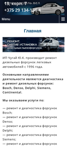 | AI-анализ | This online resource, titled "Дизель-Сервис", is a website dedicated to repair and diagnostics services for diesel fuel injection systems in light vehicles. The main focus of the business, which has been in operation since 1996, is on repairing and diagnosing diesel fuel injection components from various manufacturers, including Bosch, Denso, Delphi, Siemens, and Continental. The website offers services for the repair and diagnostics of fuel pumps, injectors, and common rail systems from these brands. All repairs are carried out using modern equipment to ensure high-quality results. The business is owned and operated by IP Chugay Y.K., who is a certified specialist with extensive experience in repairing and diagnosing diesel fuel systems. Customers are drawn to the business due to its free diagnostics (during repairs), six-month warranty on all services, |