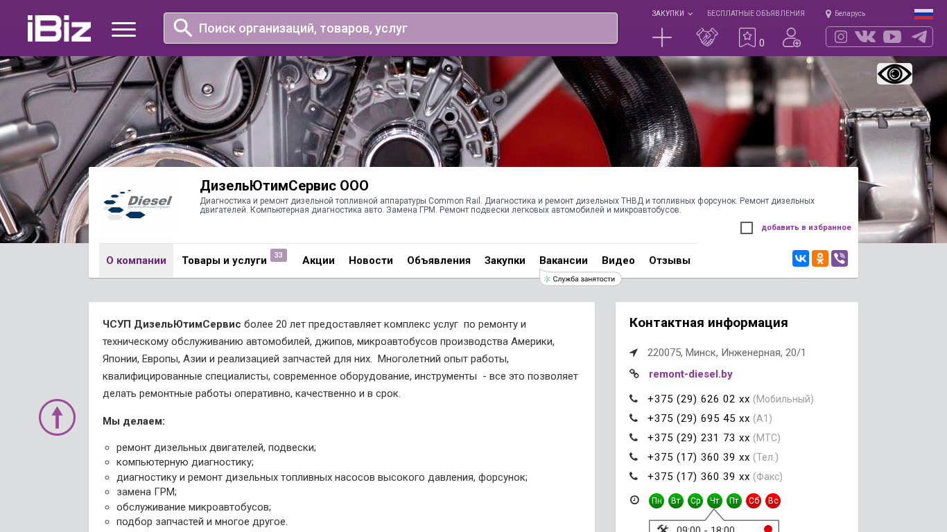 | Название / Заголовок | ДизельЮтимСервис ООО - Диагностика и ремонт дизельной топливной аппаратуры Common Rail. Диагностика и ремонт дизельных ТНВД и топливных форсунок. Ремонт дизельных двигателей. Компьютерная диагностика авто. Замена ГРМ. Ремонт подвески легковых автомобилей и микроавтобусов.. 220075, Минск, , Инженерная, 20/1 |