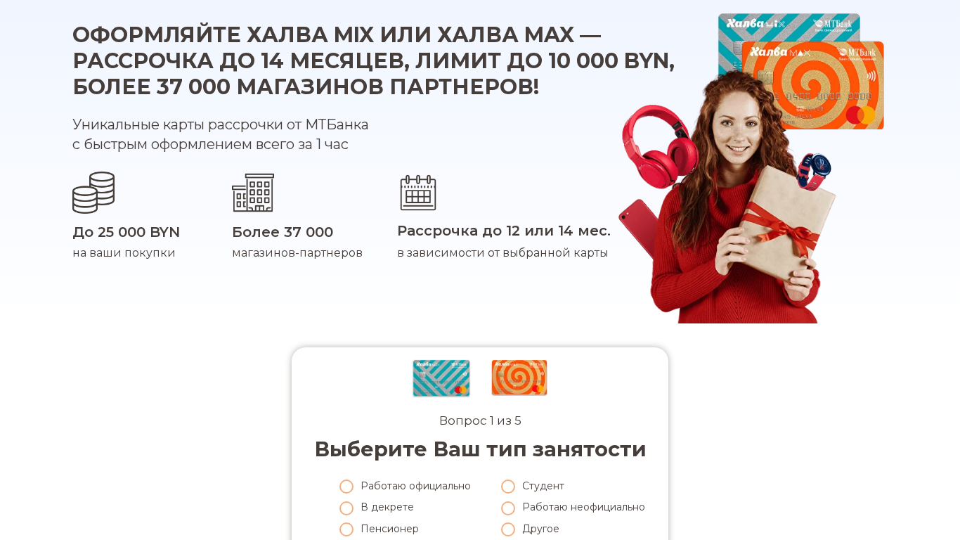 | SEO-описание | Получайте карту рассрочки Халва MIX или Халва MAX: до 14 месяцев рассрочки, лимит до 10 000 BYN, тысячи магазинов, быстрое оформление онлайн. |