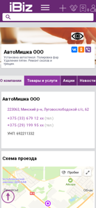 | AI-анализ | The website is for the Belarusian company 'AvtoMishka OOO', which offers automotive services including installation of windshields, car paint polishing, stain removal, and repair of cracks and chips. The business is located in the Lugovoslobodskoye rural settlement, 62, in the Minsk region of Belarus. The contact numbers for the company are +375 (33) 679 12 xx and +375 (29) 199 95 xx. The company's Unified State Register number is 692211332. The website also provides a map and information on opening hours, which are from 09:00 to 18:00, Monday to Friday, with weekends being a day off. The website is part of |