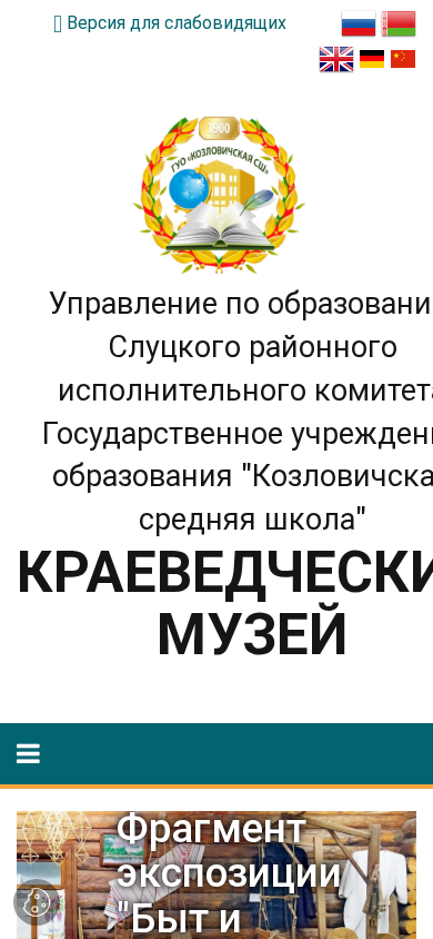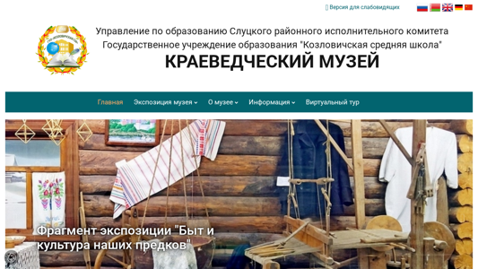 | AI-анализ | This online resource, titled 'Козловичский краеведческий музей' (Kozlovichsky krayevedcheskij muzej), is a Belarusian local history museum website. The description contains words related to exhibitions (экспозиции: 15), museum (музея: 12), exhibition (экскурсовод: 6, экспозиция: 11), history (история: 10), culture (культура: 10), our region (наших: 10, края: 4), and our ancestors (предков: 10). The top words also mention the Gusian region (Гусянская), Slutsk region (Слуцкого), and the region's people (наших: 10). The museum's name |