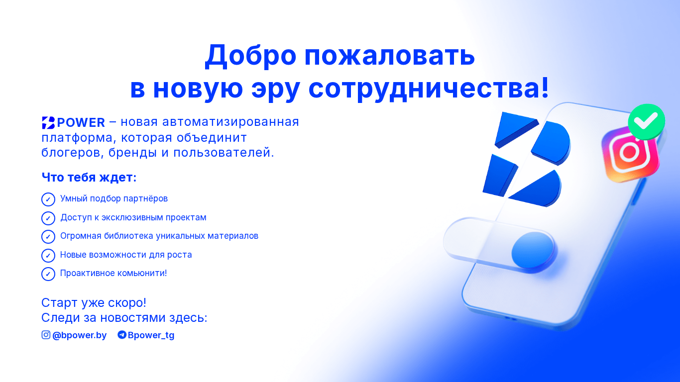 The web project BPOWER is a new era of collaboration. Welcome to a new era of partnership! BPOWER is a new automated platform that unites bloggers, brands, and users. Users can expect intelligent partner matching, access to exclusive projects, a large library of unique materials, new growth opportunities, and an active community. The start is imminent! Keep an eye on the news here: @bpower.by Bpower\_tg.