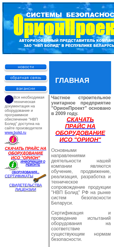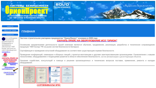 | AI-анализ | This website is an online resource for technical documentation related to the equipment and software solutions offered by the Russian company "NVP Bolid". The site provides access to downloadable prices, certifications, and information on the repair of this equipment. The company, "OrionProject", was founded in 2009 and focuses on promoting, selling, developing, and providing technical support for "NVP Bolid" products in the Belarusian market for security systems. The website also offers information on certifications and testing of the equipment to ensure compliance with safety standards. Conferences, seminars, and informational sessions are held with project-mounting and other interested organizations to introduce new technologies, equipment, and trends in the field of safety, automation, and dispatching of objects. The website provides assistance, consultations, and help in resolving organizational and technical issues related to the acquisition, application, repair, and installation |