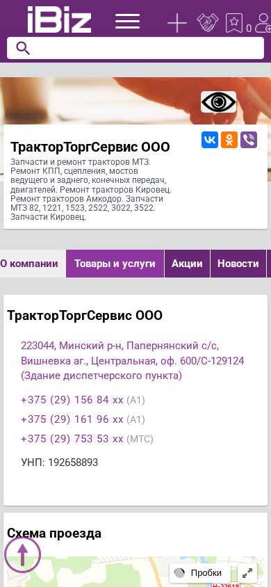 | AI-анализ | The website is a Belarusian company, TractorTorgServis OOO, specializing in the sale of parts and repair services for Minsk Tractor Plant (MTZ) tractors, including repairs to transmission systems, coupling and braking systems, drive axles, and engines. They also offer repair services for tractors from the Kirovec and Amkodor brands. The company's product range includes parts for specific MTZ models such as 82, 1221, 1523, 2522, 3022, and 3522, as well as parts for Kirovec tractors. The website provides a map for directions, contact telephone numbers, and the company's address. The company's Unified State Register number is 192658893. |