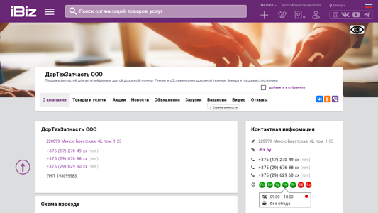 | AI-анализ | This website is a business platform for DortechZapchast OOO, a company based in Minsk, Belarus, offering sales of spare parts for road construction machinery and other heavy road equipment. The company also provides repair and maintenance services, as well as rental and sales of special equipment. The website contains information about the company's location, contact numbers, and UNP (Unified State Register of Legal Entities) number. The site also features various sections, including 'Services', 'Products', 'News', and 'Contacts'. Visitors can add the company to their favorites, view company statistics, and contact information. The company offers rental of construction equipment, auto services for road, special, and agricultural machinery, promotions, news, job vacancies, and video testimonials. The website is accessible from Monday to Friday, 9:00 AM to 6:00 PM, without lunch breaks |
