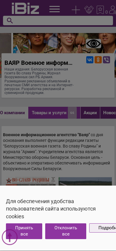 Название / Заголовок | ВАЯР Военное информационное агентство Вооруженных Сил Республики Беларусь Государственное учреждение - Наши издания: Белорусская военная газета Во славу Родины, Журнал Вооруженных сил РБ Армия. Размещение рекламных объявлений в печатных СМИ агентства и на Интернет-ресурсах. Разработка рекламной и сувенирной продукции.. 220029, Минск, , Богдановича, 29 |