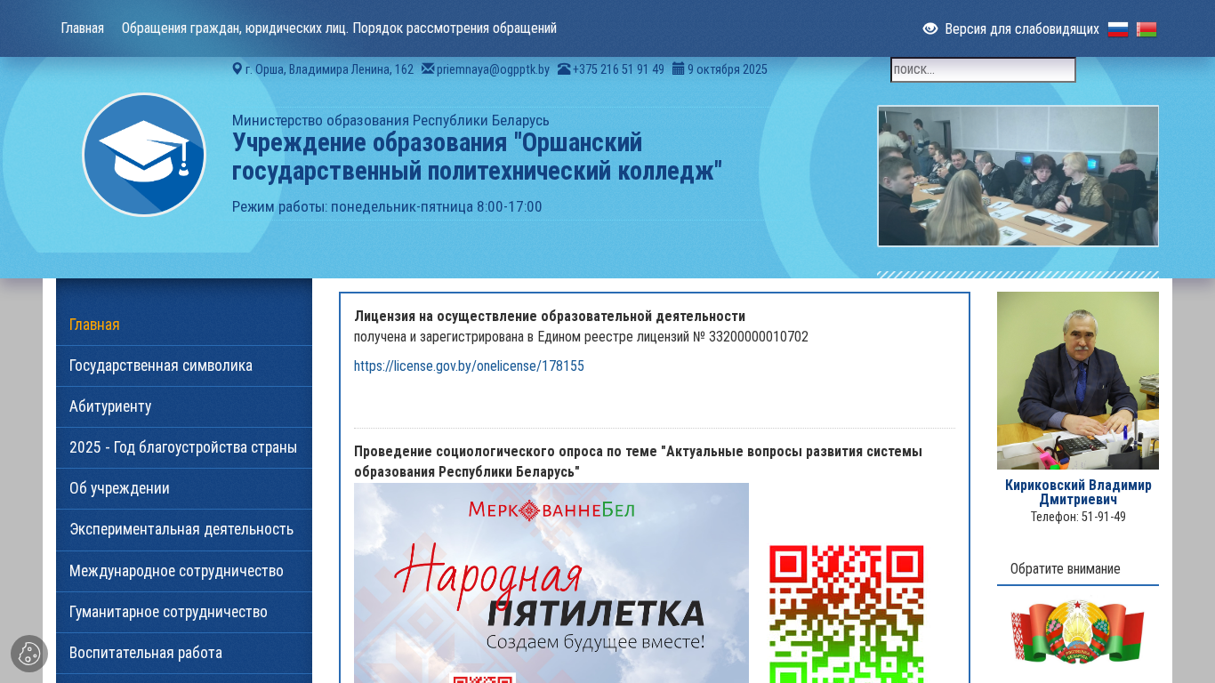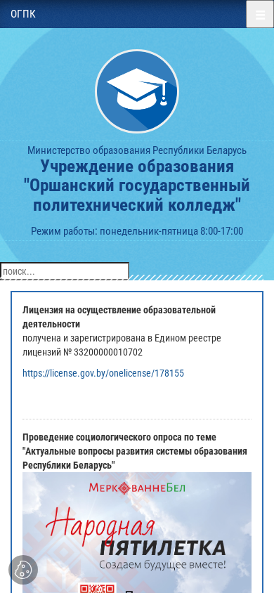 | AI-анализ | The website is the main page of the Orshansky State Politechnical College in Belarus, operated by the Ministry of Education of the Republic of Belarus. It provides information on various topics related to the college, including its location, contact details, working hours, and licenses. The college offers education and training in various fields, and the website informs about the application process, social issues, job opportunities, and other initiatives by the Ministry of Education and other government institutions. The website also includes links to various resources and documents related to the college and its activities. The keywords associated with the website include 'October 2025', 'education', 'ministry', 'republic', 'Belarus', and 'college'. The top words are '2025', 'Октября', 'образования', 'https', 'беларусь', and 'министерство'. |