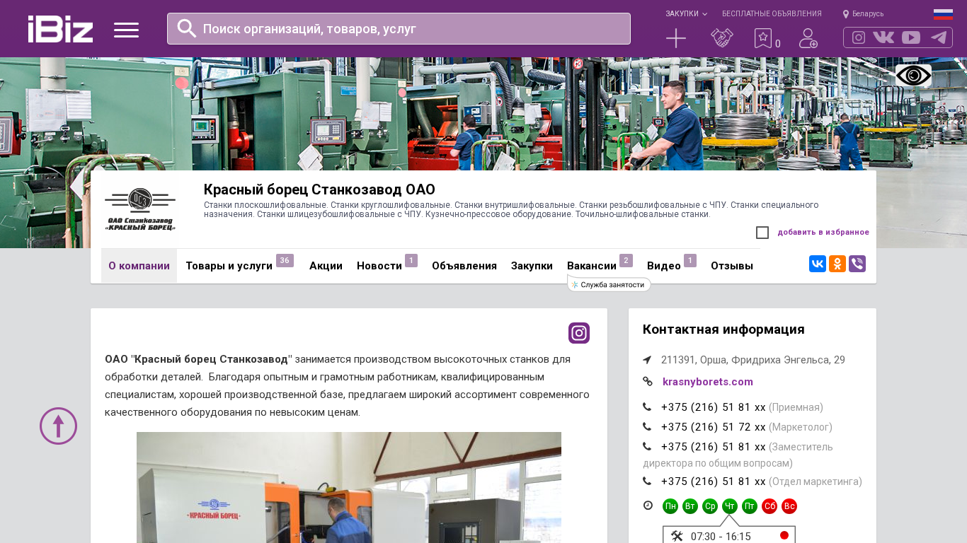 | Название / Заголовок | Красный борец Станкозавод ОАО - Станки плоскошлифовальные. Станки круглошлифовальные. Станки внутришлифовальные. Станки резьбошлифовальные с ЧПУ. Станки специального назначения. Станки шлицезубошлифовальные с ЧПУ. Кузнечно-прессовое оборудование. Точильно-шлифовальные станки.. 211391, Орша, , Фридриха Энгельса, 29 |