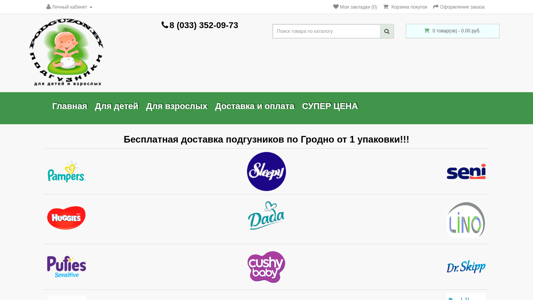 | AI-анализ | --- The website Podguzon.by is an online shop selling diapers and related products for children and adults in Grodno, Belarus. The store offers free home delivery for orders and stocks brands like Sleepy, Yofoke, Wicromed, Dailee, Skippy, Pufies, Abena, Paddlers, Pampers, Dada, Huggies, Cushy Baby, seni, Tena, Pure med, and Pampers for adults. Customers can purchase various types of diapers, including ones for swimming, as well as hygiene pads, wet wipes, and underpants. The online shop features a section for incontinence products for adults. The website also includes a shopping cart, contact information, and information about shipping and payment methods. The store's operating hours are Monday to Friday, 9:00 AM to |