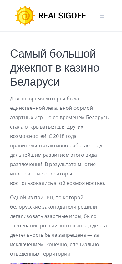 | AI-анализ | The portal realsigoff.by is a Belarusian casino website, offering the biggest jackpot in Belarusian casinos. For a long time, lottery was the only legal form of gambling in Belarus, but the country has been opening up to other possibilities since 2018. The government has been actively working on the further development of this form of entertainment, resulting in many foreign operators taking advantage of this opportunity. One reason for the Belarusian authorities to legalize gambling was the acquisition of the Russian market, where such activity was banned except for specific areas. In Belarus, you can obtain two types of licenses depending on whether you want to open a land-based or online gaming business. As of April 1, 2019, Belarus officially legalized all forms of online gambling. Operators can now offer online casino games and sports betting to players. Additionally |
