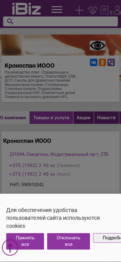 | Название / Заголовок | Кроноспан ИООО - Производство плит. Специальная и декоративная бумага. Плиты МДФ, OSB, ДСП. Смолы для древесных панелей. Меланиновые панели. Столешницы. Стеновые панели. Подоконники. Лакированный HDF. Компактные доски. Ламинаты высокого давления HPL.. 231044, Сморгонь, , Индустриальный пр-т, 27Б |