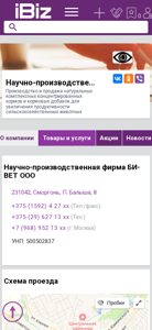| AI-анализ | The website is a Belarusian business firm, Bi-Vet OOO, specializing in the production and sale of natural complex concentrated feeds and feed additives to increase the productivity of farm animals. The company is located in Smorgon, Minsk Oblast, and their contact information includes phone numbers and an address at P. Balysha, 8. The website provides information on their products, company, and offers a contact form for inquiries. The company's Unified State Register number is 500502837. The website is also listed under the categories 'Agriculture and Forestry' and 'Farming and Livestock'. |