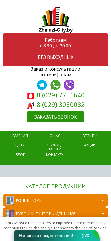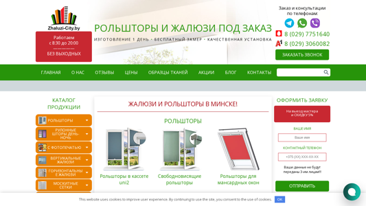 | AI-анализ | --- The portal Zhaluzi-City offers rollshades and vertical blinds for purchase in Minsk and the Minsk region. The company specializes in its own production and features promotions. They operate from 8:30 to 20:00 without weekends. Orders and consultations are available by phone at +375 29 7751640 and +375 29 3060082. The website includes a catalog of products such as rollshades for various windows, day-night rollshades, cassette rollshades, and vertical blinds in various materials and designs. Additionally, they offer decorative elements, fittings, and related products. Customers choose Zhaluzi-City because of their presence on social media and the offer of a 5% discount on all products, as well |