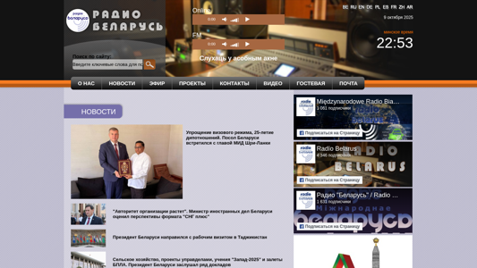 | AI-анализ | --- The portal radiobelarus.by is a news and information website for Radio Belarus. The site features articles on various topics, including diplomacy and international relations, agriculture, military exercises, and climate change. The content is primarily focused on news from Belarus and its relations with other countries. The title of the homepage is "Главная" and the description includes keywords related to Belarus, radio, interviews, and news. The site also offers video content. The top words on the site include "беларусь" (Belarus), "радио" (radio), and "интервью" (interviews). The site also mentions ongoing events, such as the United Nations General Assembly, and interviews with diplomats and officials. The site's design is simple and clean, with a focus on text and images. The menu at the top of the page includes links to |