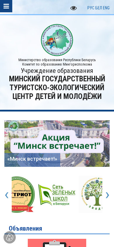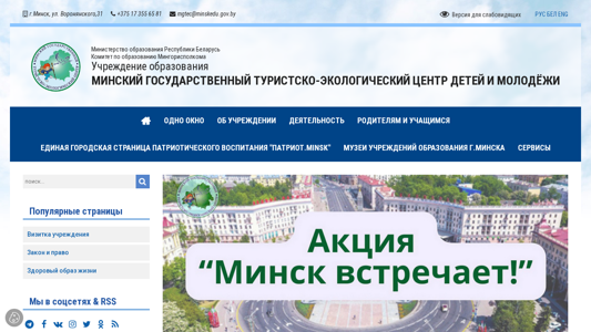 | AI-анализ | The website is the official page for the Minsk State Tourist-Ecological Center for Children and Youth, located in Minsk, Belarus, on Voронянского Street 31. The site provides information on the center's activities, including education, news, and recreational services. Keywords associated with the website include 'Minsk', 'education', 'center', 'youth', and 'tourist-ecological'. The website is managed by the Ministry of Education of the Republic of Belarus and offers various educational and recreational programs for children and young people. The site includes sections on administrative procedures, contacts, news, and various projects such as 'Museum Code', 'Ecodar', and 'History of the Country - My History'. The website also features a calendar of events, information on educational and recreational services, and various forms and documents for |