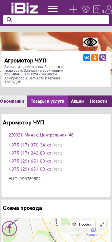 | Название / Заголовок | Агромотор ЧУП - Запчасти к двигателям. Запчасти к тракторам. Запчасти к тракторным прицепам. Запчасти к косилкам. Компрессоры. Запчасти к технике АМКОДОР.. 220021, Минск, , Центральная, 46 |