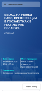 | AI-анализ | This website is for a seminar on entering markets in the Eurasian Economic Union (EEU) and preferences in state procurement in the Republic of Belarus. The registration for the event is closed and interested parties are instructed to contact BelTPP at the provided phone number for any inquiries. The seminar covers topics related to expanding the knowledge of Belarusian businesses on participating in procurements within the EEU, obtaining preferences in state procurement in the Republic of Belarus, and developing cooperation within the Eurasian Economic Union. The event is organized by the Belarusian Chamber of Commerce and Industry and will take place at the 'Pekin' Hotel in Minsk on September 16, 2025. The seminar is aimed at expanding the knowledge of Belarusian businesses in regards to participating in procurements within the EEU, obtaining |