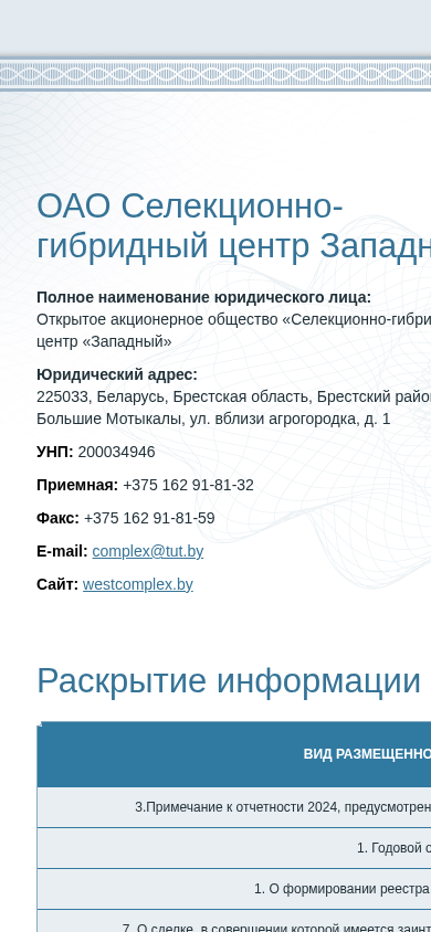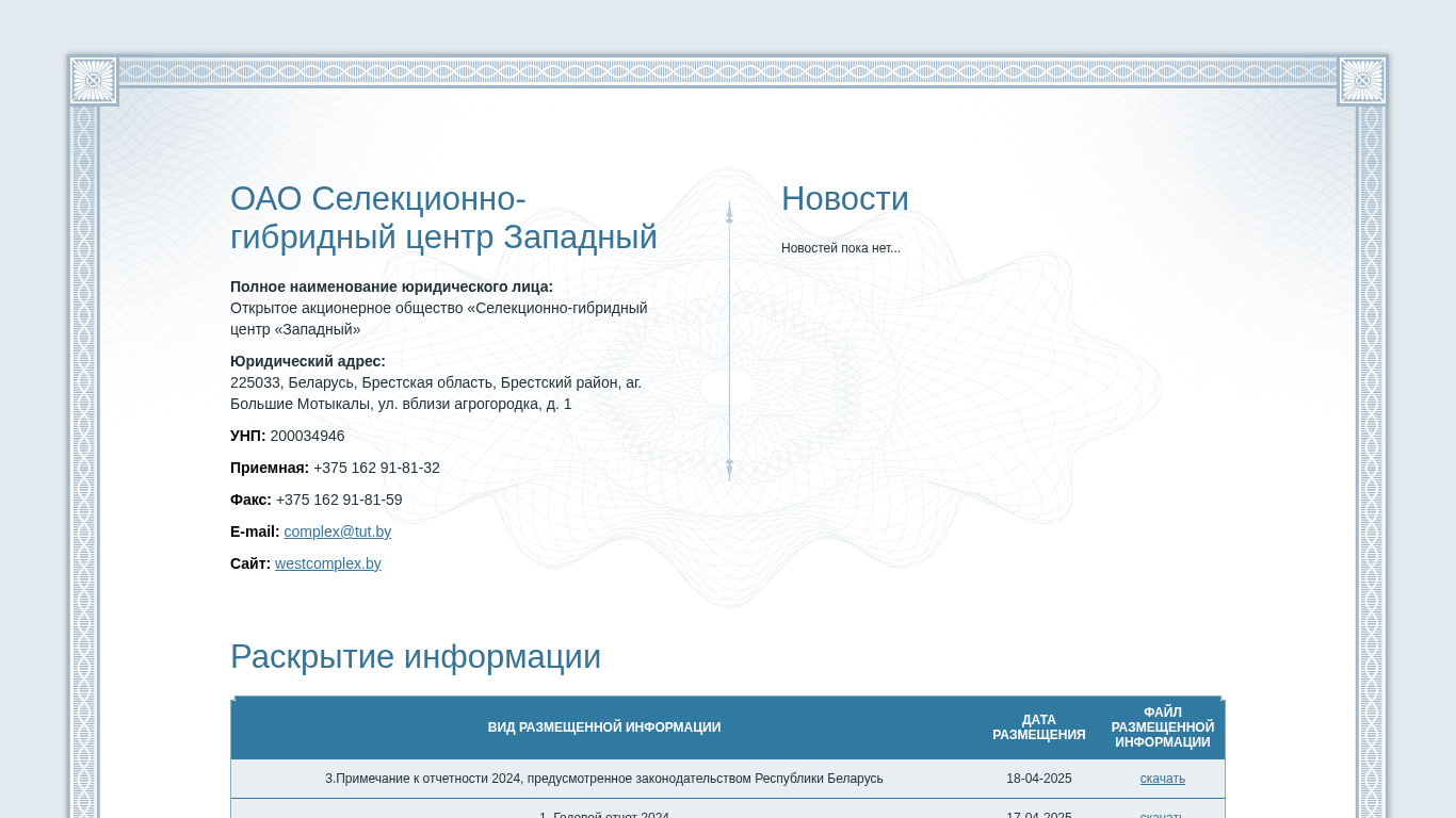 | AI-анализ | This website belongs to Open Joint Stock Company "Selection and Hybrid Center 'Western'" (ОАО "Селекционно-гибридный центр «Западный»"). It provides access to various reports and documents related to the company. The title of the website is "Selection and Hybrid Center West" and the domain is westcomplex.epfr.by. The company's full legal name and its jurisdictional address are also displayed. The website contains downloadable files such as annual reports from 2022 to 2025, registrar reports of beneficial owners of securities, and notices of significant transactions involving affiliated parties of the company. There are also documents related to the formation of the securities register and auditor reports. The website does not contain any visible news section. |