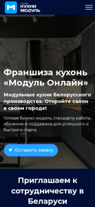 | AI-анализ | The website is for a franchise business of kitchen showrooms called "Модуль Онлайн" in Belarus. The title and description suggest buying a franchise for a "Модуль Онлайн" kitchen salon. The business model is proven and efficient. The website provides information on investment, support, and contacts, including a phone number for a callback. The franchise offers modular kitchens made in Belarus and the opportunity to open a salon in one's city. The business model includes standards for operation, training, and support for a successful and quick start. The website invites partnerships in Belarus and offers the possibility of exclusive rights in certain regions. Cities available for salon opening include Slonim, Slutsk, Slohimsk, Soligorsk, Svetlogorsk, and others, with some cities not listed. The investment for opening a salon |