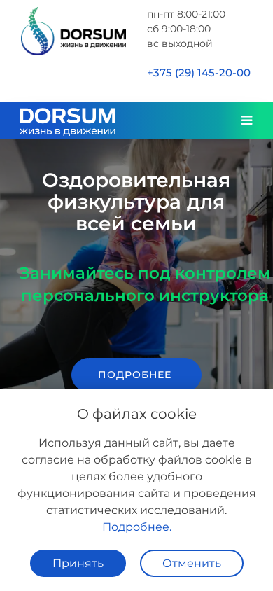| AI-анализ | The website DORSUM.by is a health and wellness center located in Minsk, Belarus. It offers various services such as therapeutic physical training, EMS/EMA workouts, and kinesiotherapy. The center provides individual sessions with specialized trainers and instructors with medical education. The operating hours are from Monday to Friday, 8:00 AM to 9:00 PM, on Saturdays from 9:00 AM to 6:00 PM, and closed on Sundays. The contact number is +375 (29) 145-20-00. The website also includes information on vacancies for a cashier specialist and an instructor. The center offers personalized training programs for families and emphasizes the benefits of modern health restoration methods in one place. The EMS/EMA training involves muscles contracting under electrical impul |