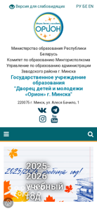 | AI-анализ | The website is the official online presence of the 'Дворец детей и молодежи «Орион»' (Orion Palace for Children and Youth) state educational institution located in Minsk, Belarus. The website provides information on the structure, tasks, and functions of the administration, conditions for admission, important documents, and various services offered by the institution. It also features sections on history, achievements, anti-corruption efforts, and humanitarian projects. The website includes a section on vacancies, a calendar of events, a media center, and a section for students of the 2025/2026 academic year. Various associations and organizations are listed, as well as information on sponsorship and scholarships for children in need. The website is accessible through a single entrance and includes a schedule for the administrative office and reception of citizens, as well as administrative procedures and contact information for various |