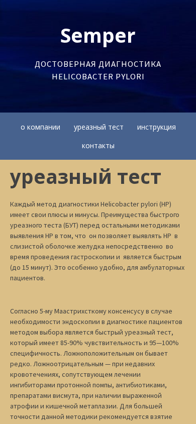 | AI-анализ | The portal Semper is a reliable diagnostics resource for HELICOBACTER PYLORI. The website provides information on the advantages of the urease test (BUT) method for diagnosing Helicobacter pylori in the stomach. This test is beneficial as it allows for the direct detection of Helicobacter pylori in the stomach lining during endoscopy procedures, and it is a quick test that takes only 15 minutes. The website highlights its suitability for ambulatory patients and mentions the high sensitivity and specificity of this method. However, it warns of potential false negatives in cases of recent bleeding, certain medications, and advanced stomach conditions. The website offers a kit for self-preparation of the urease test solution "ex tempore" before use. This means users prepare the test solution directly before use by adding water to the provided re |
