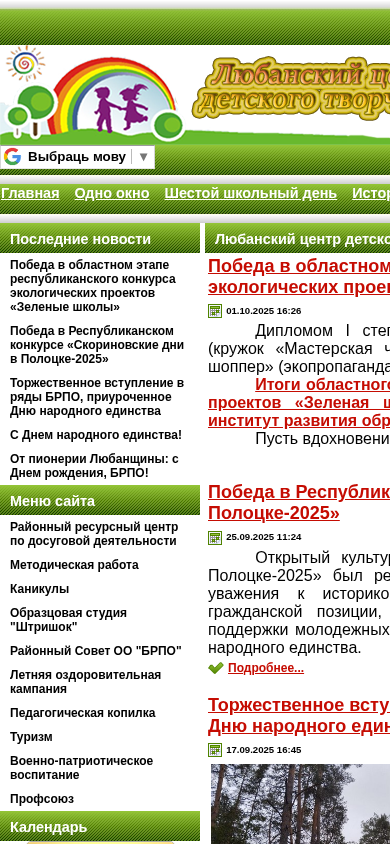 | AI-анализ | The portal "Любанский центр детского творчества" (Lubansky Center for Children's Creativity) is a state educational institution located in the city of Luban, Belarus, specifically at ul. Lenina, d.89. The website provides information about the center, its achievements, and various activities. These include historical and contemporary aspects of the organization, methodological work, vacation programs, an example studio called "Штришок," a regional council, a pedagogical resource, tourism, and military-patriotic education. Additionally, the website features a calendar, a Joomla calendar, and news about the center's victories in local and republican competitions, such as the "Зеленые школы" (Green Schools) and the "Скориновские дни в Полоцке-2025" |