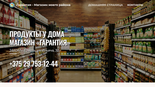 | AI-анализ | This online resource, titled "Гарантия — Магазин моего района" (Guarantee - Shop in my district), is a local e-commerce store based in the city of GoMEL, Belarus, with the address 32, Ilyicha street. The website offers a range of products including milk, sausages, cheese, oil, sugar, bread, canned goods, and beverages. The contact information is provided with three phone numbers and an email address. The shop's opening hours are specified for both the summer and winter periods. The main menu consists of the Home page, Contacts, and Products categories. The website is operated by OOO "Гарантия" and was produced by AMNESIA. |