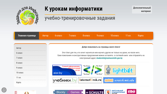 | AI-анализ | The website 'К урокам информатики "Учебно-тренировочные задания"' is a blog for students of the 6th to 11th grades in the field of informatics. It offers additional materials and educational tasks beyond the classroom. The main page includes a menu and a welcome message for visitors. The author's name, Галина Адамовна Staskevich, and contact information, staskevich@rooivacevichi.gov.by, are provided. The website is governed by two policies, one for personal data handling and one for cookie usage. The domain is registered under 'ВЕБ-МАСТЕРСКАЯ.БЕЛ'. |