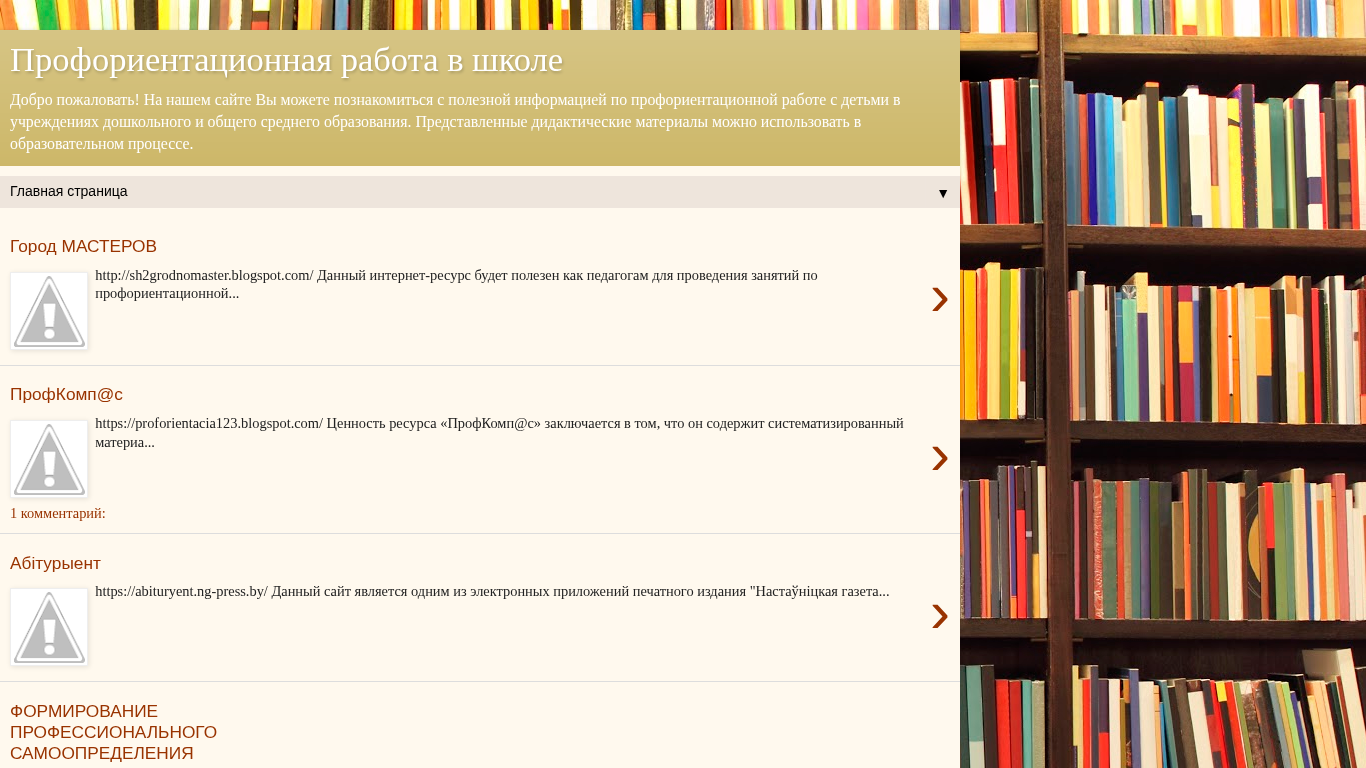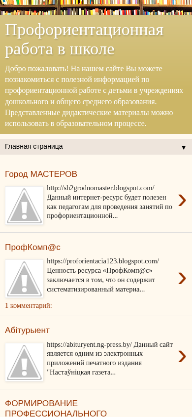 | AI-анализ | The website is a blog dedicated to providing information about professional orientation work in schools. It offers educational materials that can be used in the educational process. The website includes pages such as the homepage, educational process, methodological recommendations, and a joint presentation. The blog also features links to other websites such as 'ProfComp@s' and 'Drofa - Ventana'. 'ProfComp@s' is a resource containing systematized materials for professional orientation work. The blog has one comment from an 'Abituryent' user. Another page on the blog offers a document on 'The formation of professional self-determination of students'. The website also features a link to 'Moiro.by', an educational portal. There is one comment on this page. Additionally, there is a link to the 'Oblastny proforientatsionny portal' for the 'Mogilevsky state regional |