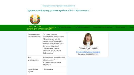 | AI-анализ | This online resource is the official website for "Дошкольный центр развития ребёнка №7 г. Волковыска" (Preschool Centre for Child Development No.7 in the city of Volkovysk, Belarus). The website is available in Belarusian, Russian, and English versions for users with varying proficiency levels. The title of the website is "Дошкольный центр развития ребёнка №7 г. Волковыска" (Preschool Centre for Child Development No.7 in the city of Volkovysk). The description of the website mentions the institution's leadership, work schedule, objectives and functions, and historical background. The keywords include "образования" (education), "день" (day), "учреждения" (institutions), "дошкольного" (preschool), |