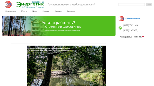 | AI-анализ | The website is for Sanatorium "Energetik" RUP "Mogilevenergo," a year-round health resort and spa. It offers a full range of therapeutic and preventative services to help visitors restore their bodies and prevent various illnesses. The contact information for the resort includes the phone numbers (0222) 78 21 69 and (0222) 293 305, as well as the hours of operation from 8:00 AM to 5:00 PM. The site also includes information about accommodations, news, and prices. |