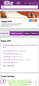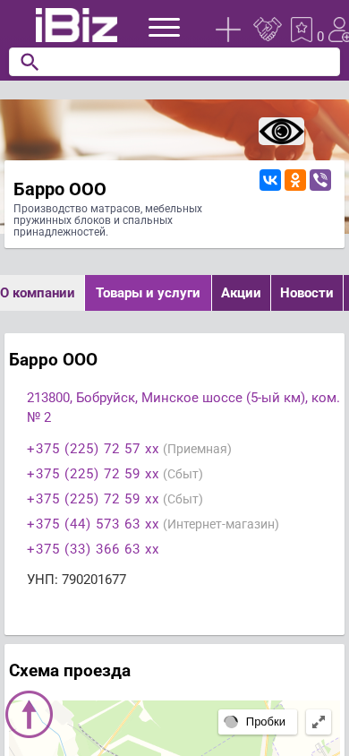 | AI-анализ | The web project "Barro OOO" is a Belarusian company based in Bobruisk, specialized in the production of mattresses, furniture spring blocks, and sleep accessories. The company's address is on Minское shosse (5th km), community number 2, with contact numbers +375 (225) 72 57 xx (Reception), +375 (225) 72 59 xx (Sales), and +375 (44) 573 63 xx (Internet Shop). The website provides information on the company, its products and services, including furniture fittings and components. The company offers custom-made furniture and sells mattresses, and the site includes sections for news, announcements, vacancies, and customer reviews on social media platforms such as VKontakte and Od |