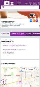 | AI-анализ | The website is an online business directory listing for Bogolin OOO, a company located in Bobruisk, Belarus, specializing in the production of wooden barrels and crates according to customer designs. The contact information, including phone number and address, is provided. The company offers wooden packaging and products made from timber, including various types of barrels and crates. The website also mentions the production of European-style barrels and the availability of oak and birch barrels. Business hours are listed as Monday to Saturday, 9:00 AM to 6:00 PM, with no lunch break. The page includes a map for directions and links to related categories such as 'Tara and Upakovka' (packaging and containers) and 'Isdelya iz dereva' (wooden items). The website is part of the AYBIZ Media catalog of Belar |