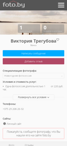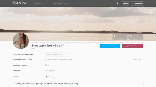 | AI-анализ | The portal is a photography website by Victoria Tregubova from Minsk, Belarus. The site features a category for New Year's photography sessions. Victoria Tregubova offers her photography services for New Year's sessions in Minsk. The website also includes a catalog of photographers, a community for photographers, and options for individual, family, and corporate photo sessions, among others. The site offers pricing starting from 220 rubles for a one-hour session, and covers various photography styles and genres. The site includes a blog, photo gallery, and contact information for Victoria Tregubova. |