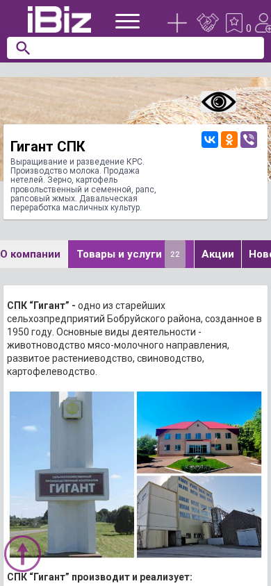 | Название / Заголовок | Гигант СПК - Выращивание и разведение КРС. Производство молока. Продажа нетелей. Зерно, картофель провольственный и семенной, рапс, рапсовый жмых. Давальческая переработка масличных культур. . 213857, , Большие Бортники аг. |