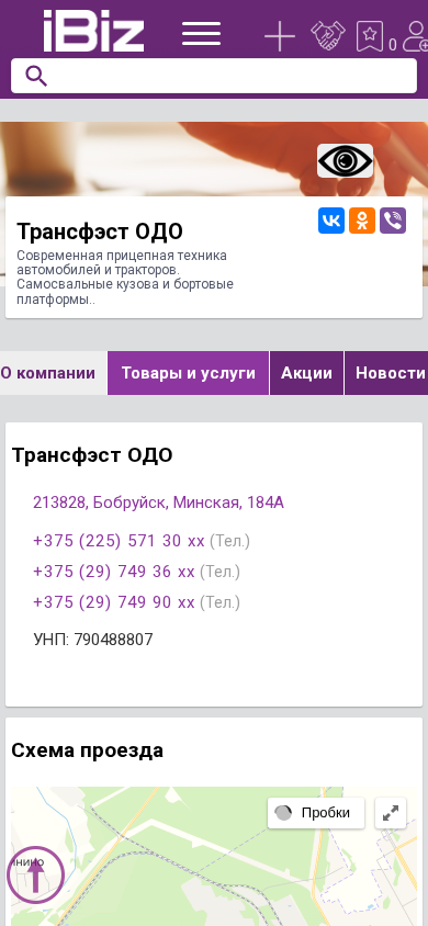 | Название / Заголовок | Трансфэст ОДО - Современная прицепная техника автомобилей и тракторов. Самосвальные кузова и бортовые платформы... 213828, Бобруйск, , Минская, 184А |