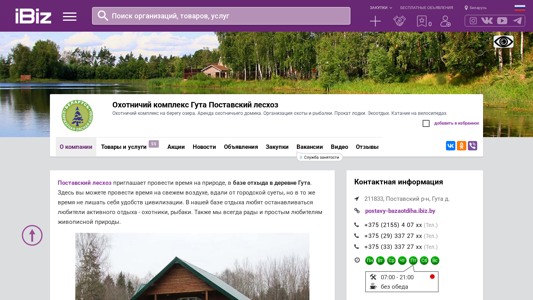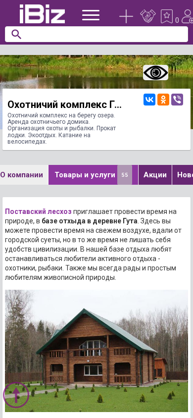 | Название / Заголовок | Охотничий комплекс Гута Поставский лесхоз - Охотничий комплекс на берегу озера. Аренда охотничьего домика. Организация охоты и рыбалки. Прокат лодки. Экоотдых. Катание на велосипедах. . 211833, , Гута д. |
