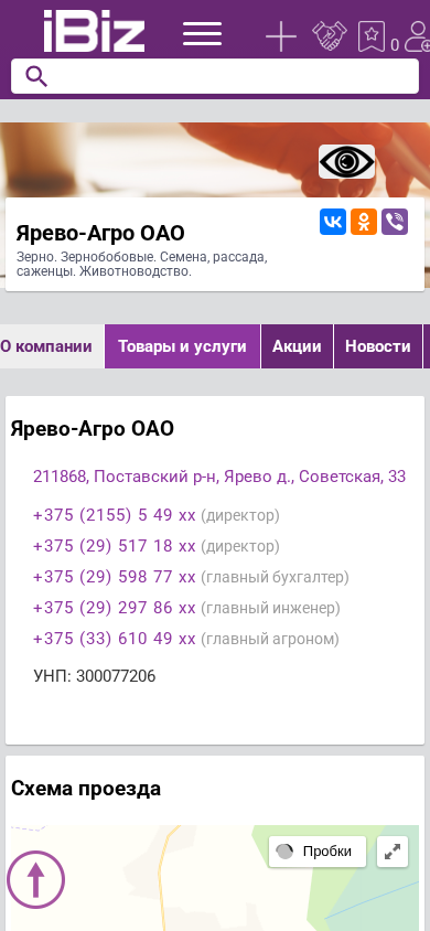 | AI-анализ | The website is for Ярево-Агро OAO, a company located in the Sovietskaya district of the village of Ярево, Postavsky region in Belarus. The website provides information about the company's offerings in the agriculture sector, specifically related to grain, legume seeds, seedlings, and livestock. The contact information for the director, director, chief accountant, chief engineer, and chief agronomist are listed on the website. The company's UNP number is 300077206. The website includes a map for visitors to find the company's location, as well as information about the company's operating hours, which are from 9:00 to 18:00, Monday through Friday, with weekends being a day off. |