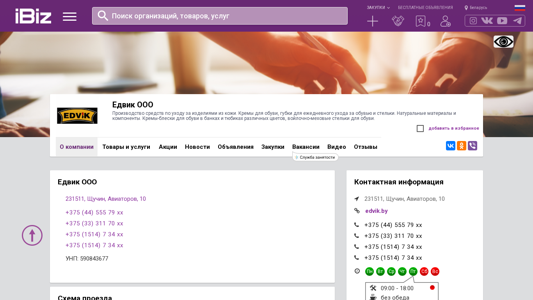 | AI-анализ | This online resource is dedicated to Edvik OOO, a company based in 231511, Schuchin, Aviatov Street 10, specializing in the production of care products for leather items. Their offerings include creams for footwear, daily care brushes for shoes, and steels for footwear. They use natural materials and components. Additionally, they provide cream-shines for footwear in various colored cans and jars, as well as woolen-fur steels for footwear. The website includes a map for directions, contact phone numbers, and the company's UNP number. The opening hours are from 9:00 AM to 6:00 PM, Monday through Friday, with Saturdays and Sundays being closed. |