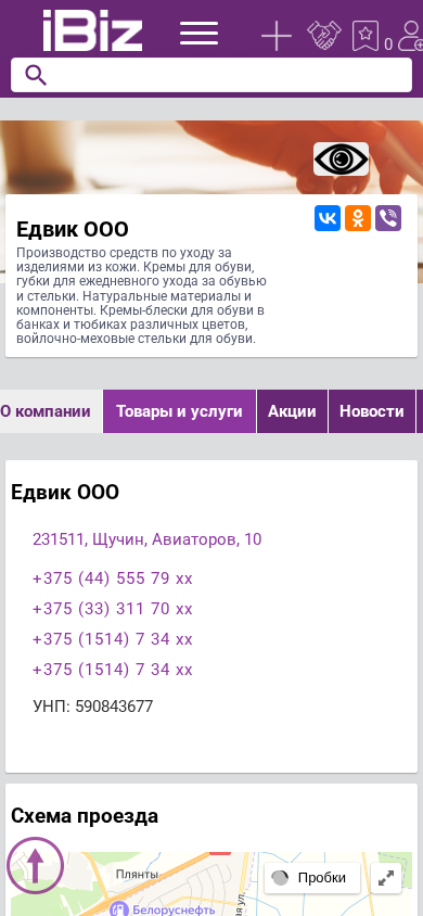 | Название / Заголовок | Едвик ООО - Производство средств по уходу за изделиями из кожи. Кремы для обуви, губки для ежедневного ухода за обувью и стельки. Натуральные материалы и компоненты. Кремы-блески для обуви в банках и тюбиках различных цветов, войлочно-меховые стельки для обуви.. 231511, Щучин, , Авиаторов, 10 |