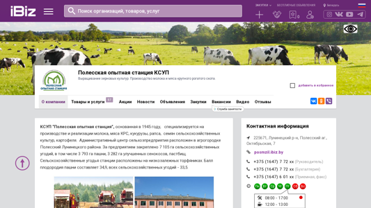 | Название / Заголовок | Полесская опытная станция КСУП - Выращивание зерновых культур. Производство молока и мяса крупного рогатого скота.. 225671, , Полесский аг., Октябрьская, 7 |