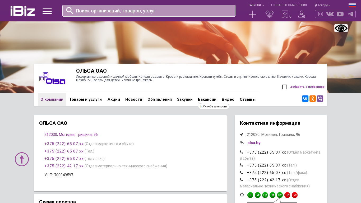 Название / ЗаголовокОЛЬСА ОАО - Лидер рынка садовой и дачной мебели. Качели садовые. Кровати раскладные. Кровати-тумбы. Столы и стулья. Кресла складные. Качалки, лежаки. Кресла шезлонги. Товары для детей. Уличные тренажеры.. 212030, Могилев, Гришина, 96