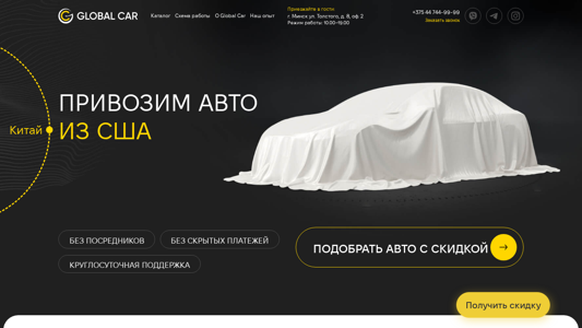 | AI-анализ | --- This online resource is a car import catalog from the USA, titled "Привозим авто ИЗ США" (Bringing Cars From the USA). The website offers a wide range of cars with various makes and models, including BMW X3, BMW X7, Buick Encore, Chevrolet Equinox, Chevrolet Malibu, Ford Edge, Honda Accord, VW Jetta, Volkswagen Tiguan, and others. Users can find information about the car's body type (sedan or crossover), engine, year of production, and price. The website also mentions that the cars come without intermediaries and with no hidden payments. It provides round-the-clock support and offers discounts on selected vehicles. The catalog lists cars with minor damages that can be easily repaired, and the delivery times are stated to be quick. The |