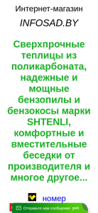 | SEO-описание | Интернет-магазин по продаже теплиц, парников, беседок из поликарбоната, садовой и строительной техники, широкий выбор товаров для благоустройства дачь и приусадебных участков. В каталоге продукции компании «ИнфоСад» вы можете выбрать и заказать садовую технику, которая вам необходима склад находится в городе Минск, товар можно преобрести по цене производителя. Мы являемся официальными дистрибьютерами садовой техники представленой на сайте, поэтому у нас цены установленны производителем. Наши поставщики подтверждают качество произведенной продукции гарантийными обязательствами и придерживаются единой политики в ценообразовании розничной и оптовой цены. |